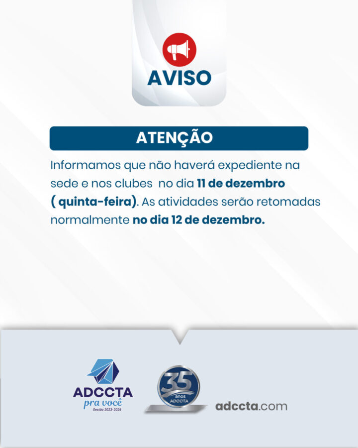 Informamos que não haverá expediente na sede e nos clubes da ADCCTA nesta