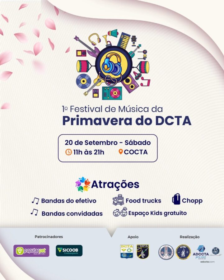Participe do 1º Festival de Música da Primavera do DCTA! 🌸 No dia 20 de setembro, sábado, o evento promete um dia completo de arte, cultura e entretenimento.