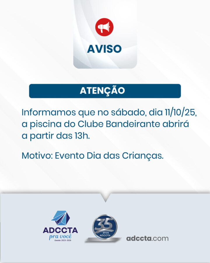 Informarmos que no sábado, dia 11/10/2025, a piscina do Clube Bandeirante abrirá a partir das 13h.