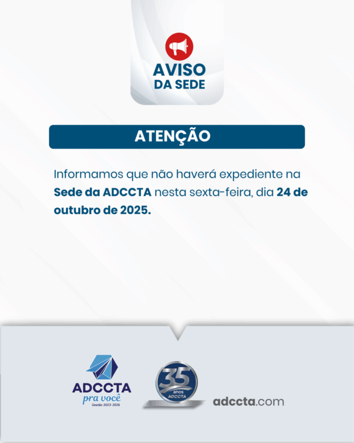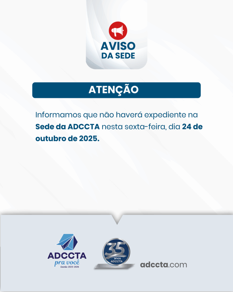 Informamos não haverá expediente na Sede da ADCCTA nesta sexta-feira, dia 24 de outubro de 2025.
