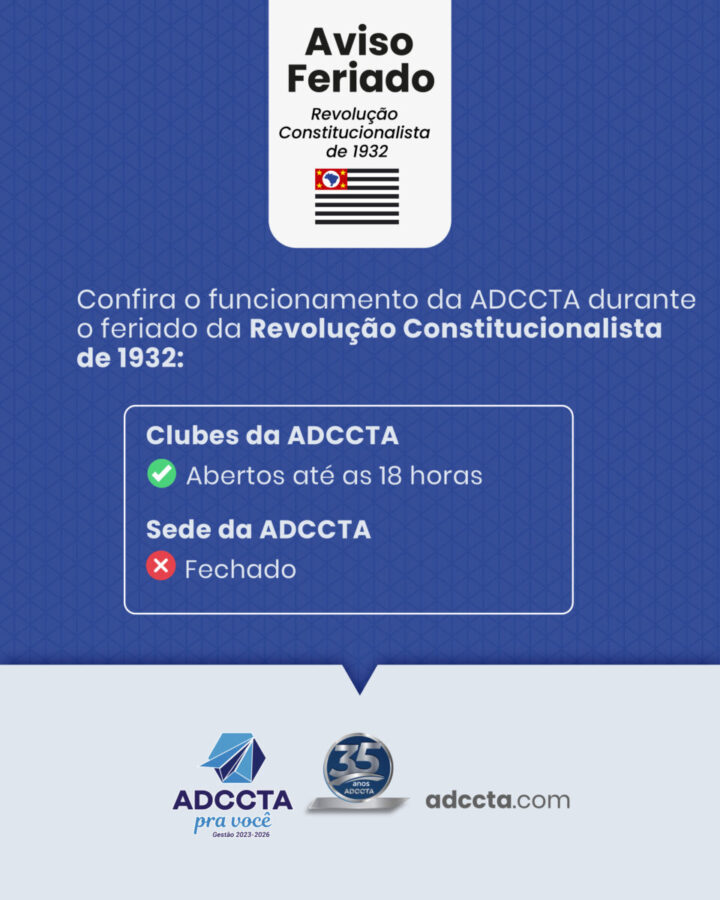Confira o funcionamento da ADCCTA durante o feriado de 09/07 – Revolução Constitucionalista de 1932: