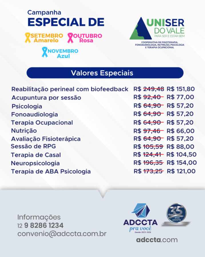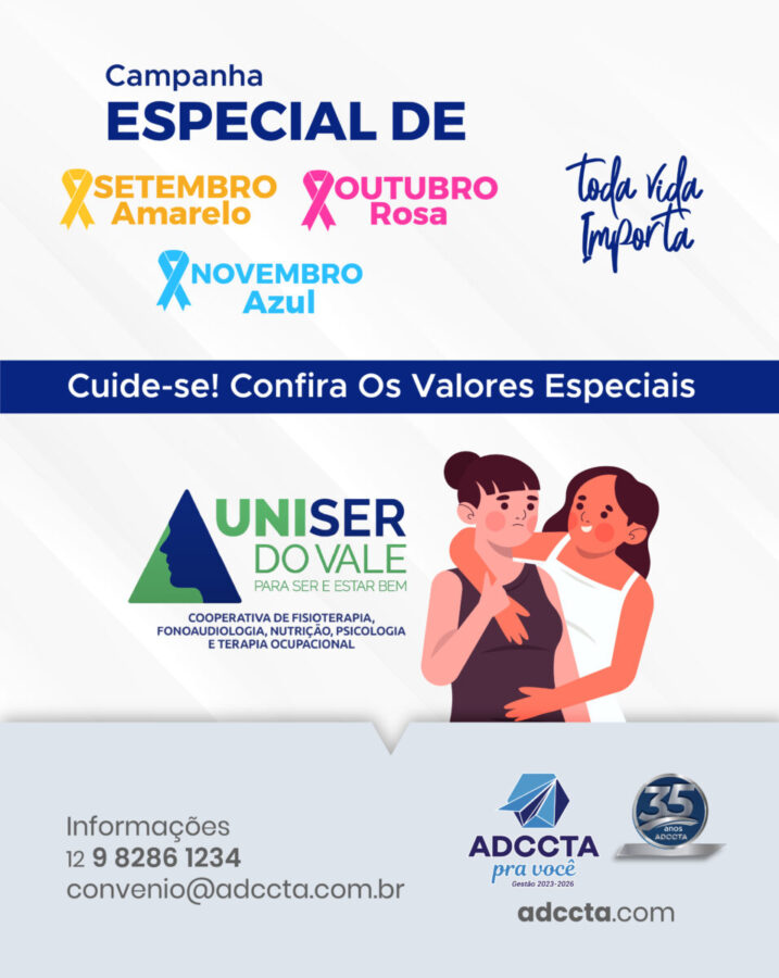 O cuidado integral com a saúde. Em apoio às campanhas Setembro Amarelo, Outubro Rosa e Novembro Azul, a ADCCTA, em parceria com a UNISER DO VALE, oferece condições especiais para os associados.